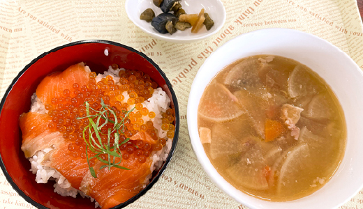 ぴっぷスキー場には2か所の食堂があります。センターハウス内では、麺類、丼もの、カレーなどの定番メニューが良心的な価格で提供されています。すべて地元産の食材を使っている卵かけごはん定食や、おにぎり+豚汁など、日本の庶民の食文化を満喫できます。ニジマス丼は「雪番屋」、から揚げ丼などはレストラン「ほくれいロッジ」で提供しています。